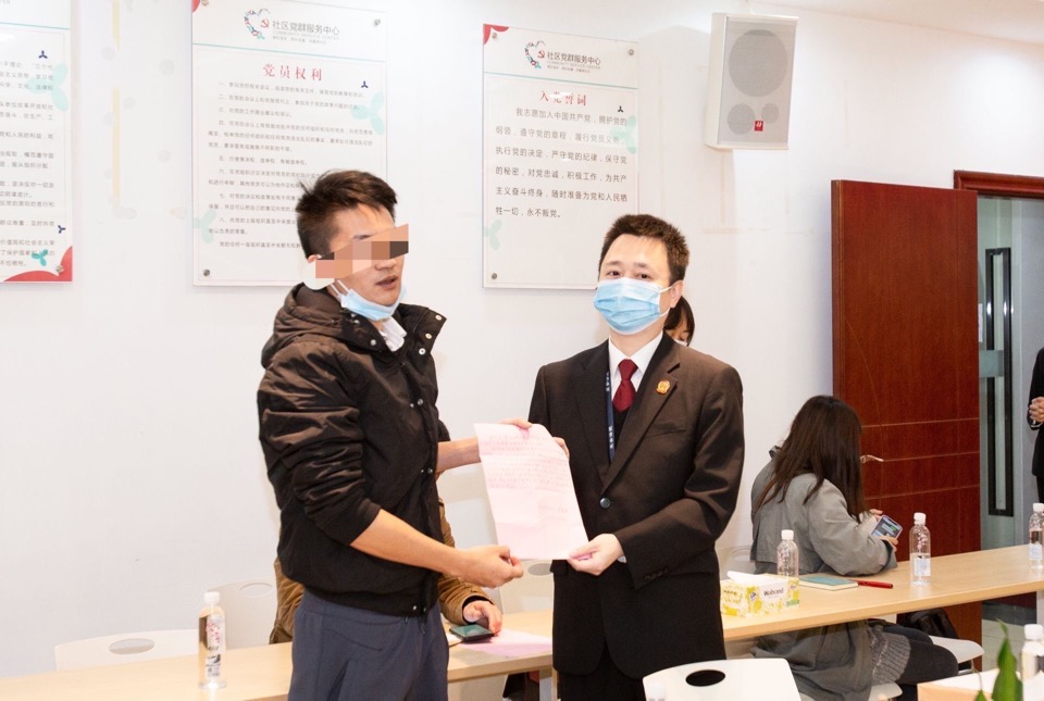 交付現場,在人大代表和司法監督員的見證下,首先對返還的位於西鄉街道鳳凰崗東六巷一處自建樓和位於西鄉街道鳳凰崗東七巷某處樓房50%的產權進行現場解封和勘驗工作。隨後在交接儀式上,承辦法官與被害人現場製作了返還筆錄,並將房產鑰匙交於被害人手上。被害人現場對法院表示誠摯地感謝,感謝法院為百姓主持公道和維護安定的社會秩序,並送上感謝信。
