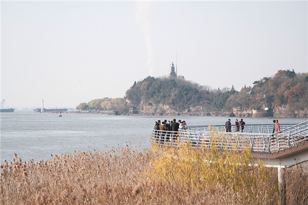 在南通市五山地區濱江片區,一波接一波的團體遊客在長江親水棧道行走,感受綠水青山的生態美。