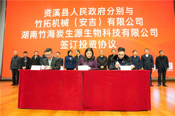 17日會議現場,資溪縣人民政府分別與國際竹藤組織等單位在推介會現場簽訂了技術服務協議、供應鏈戰略合作協議、投資協議。峰會還邀請了林業專家學者以《抓住歷史機遇,在資溪打造中國竹產業創新新高地》、《世界貿易新發展格局》等為題作主題報告。同日,落戶資溪縣竹科技產業園區的江西吉中竹業有限公司正式投產。與會人員還參觀考察了項目生產加工場地。