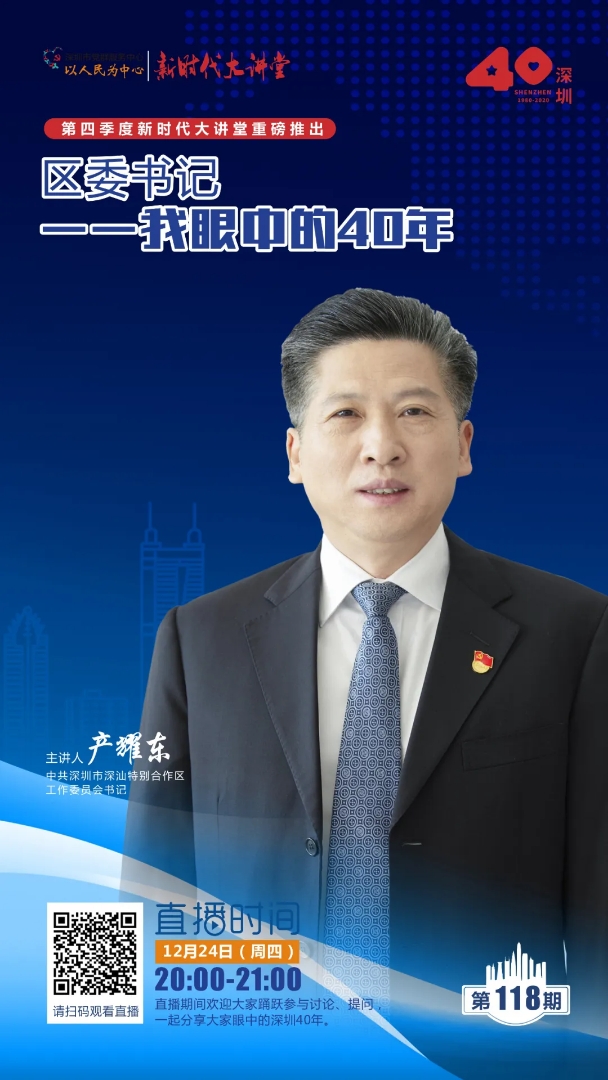 12月24日第118期新時代大講堂,深圳市深汕特別合作區黨工委書記產耀東作為主講嘉賓,以「輝煌成就四十年 不忘初心再出發」為題,從深圳40年發展的啟示、深汕飛地承載的時代使命、深汕合作區的發展路徑三個方面,講述「規劃引領、基礎先行、平台帶動、產城融合」中的深汕特別合作區,在深圳經濟特區建立40周年和「雙區」建設重要節點,堅持黨的全面領導,始終沿着正確方向前行,時刻望鵬,砥礪奮進,奮力把這片嶄新區域加快建設成為粵港澳大灣區東部門戶、粵東沿海經濟帶新中心、深圳市自主創新拓展區和現代化國際性濱海智慧新城。