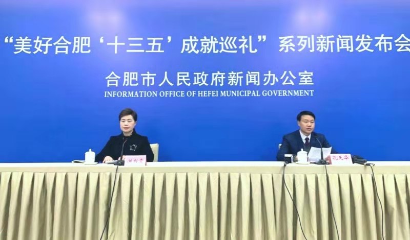「美好合肥『十三五』成就巡禮」系列新聞發佈會(第五場),合肥市委宣傳部副部長洪書霞(左)主持發佈會,市財政局黨組成員、副局長孔天華介紹相關情況(孫軍/攝)