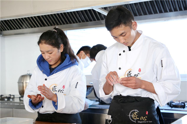 參與這堂實訓課的是一批遠道而來的客人——西藏山南市職業技術學校22名烹飪專業師生。他們在蚌埠商貿學校參加為期一個月的跟崗訪學活動,學習交流,「充電」提升。