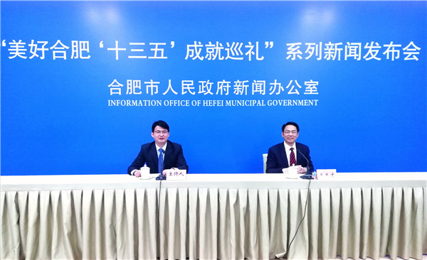 「美好合肥『十三五』成就巡禮」系列新聞發佈會(第十一場),合肥市委宣傳部外宣辦主任趙明錄(左)主持發佈會,市教育局黨委書記、局長王傑才介紹相關情況(孫軍/攝)