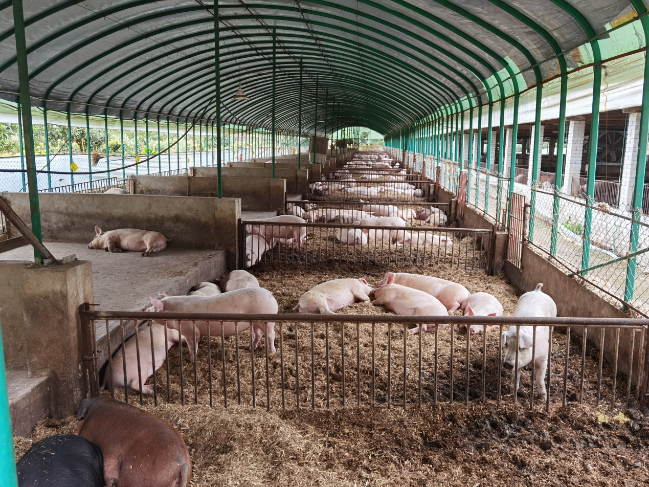 安徽黃山市歙縣深渡富順畜禽養殖場利用農作物秸稈發酵墊料養豬技術飼養生豬500頭。滿圈肥豬待出欄,豐富“兩節”菜市場