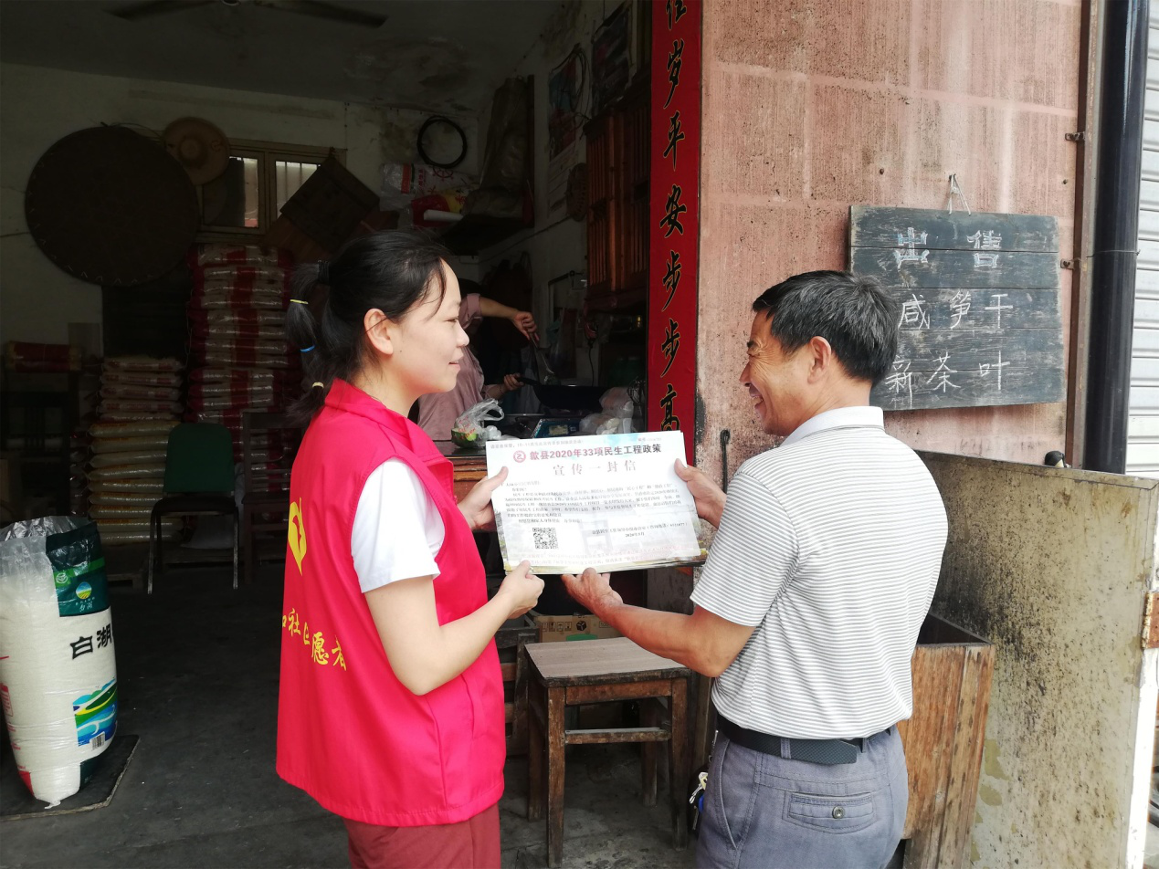 印製民生工程政策宣傳“一封信”15萬份。由各鄉鎮組織鄉村幹部入戶發放,逐戶編號存檔。在鄉鎮為民服務大廳及銀行、醫院、學校、村委會等場所增設“微窗口”,由鎮、村兩級民生工程資訊員不定期開展民生工程政策宣講。在全縣19個郵政網點、137個郵樂購網點搭建民生工程民生工程政策宣傳平臺。編制民生工程政策宣傳廣告,定向發送至縣內近20萬微信APP用戶微信朋友圈動態。
