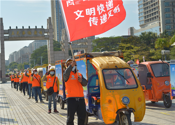 快遞小哥和外賣騎手們身着統一印有文明口號的着裝出發