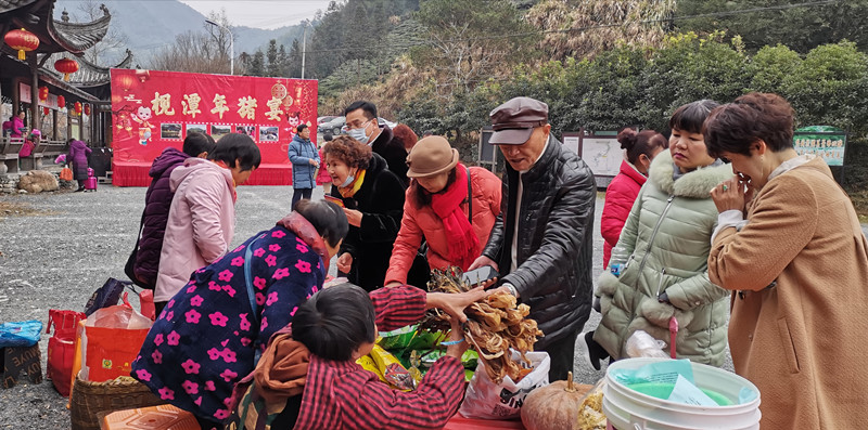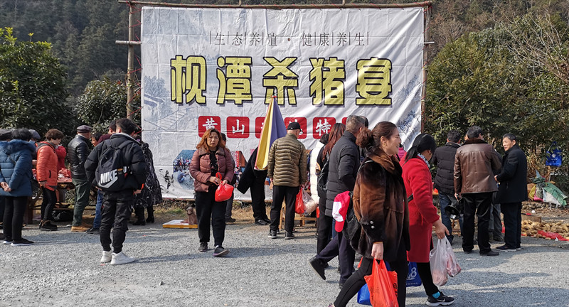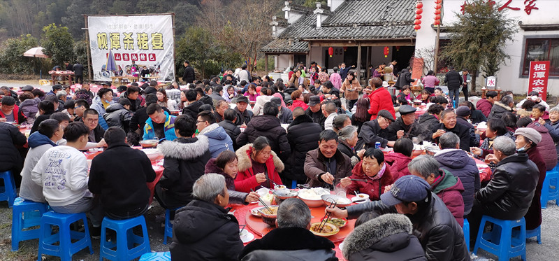 趕年節是徽州山村特有的節日習俗,每逢冬至過後,村民們便開始殺豬宰羊,吃殺豬飯,籌辦年貨,做粿包粽子,準備風風光光過大年。當天活動現場,主辦方準備充分,有條不紊。停車場上停滿了來自各地的大巴車。