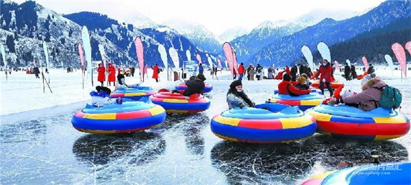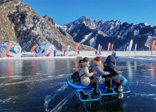 元旦當天,天山天池景區冰上娛樂項目也正式營業,電動碰碰車、冰壺保齡球、冰上飛魚、冰上單車等十餘種冰上項目,讓冬日裏的天池多了更多歡聲笑語。七千餘名遊客懷揣着對新年的美好期待,登高天山天池迎新納福,以傳統而又特別的方式迎接2021年的到來。除了迎新納福,天池湖面上的冰上娛樂項目備受遊客青睞。