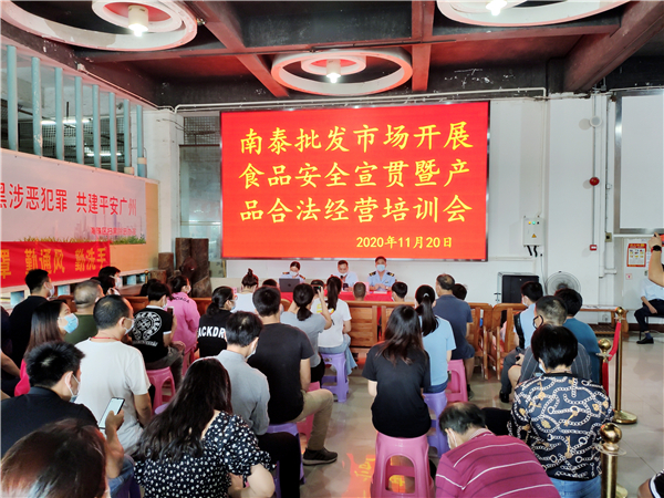 為強化保健食品科普知識宣傳,提升群眾自我保護和維權意識,廣州市市場監管部門積極開展保健食品行業專項清理整治行動宣傳活動。圖為執法人員在南泰批發市場開展食品安全宣貫培訓會。