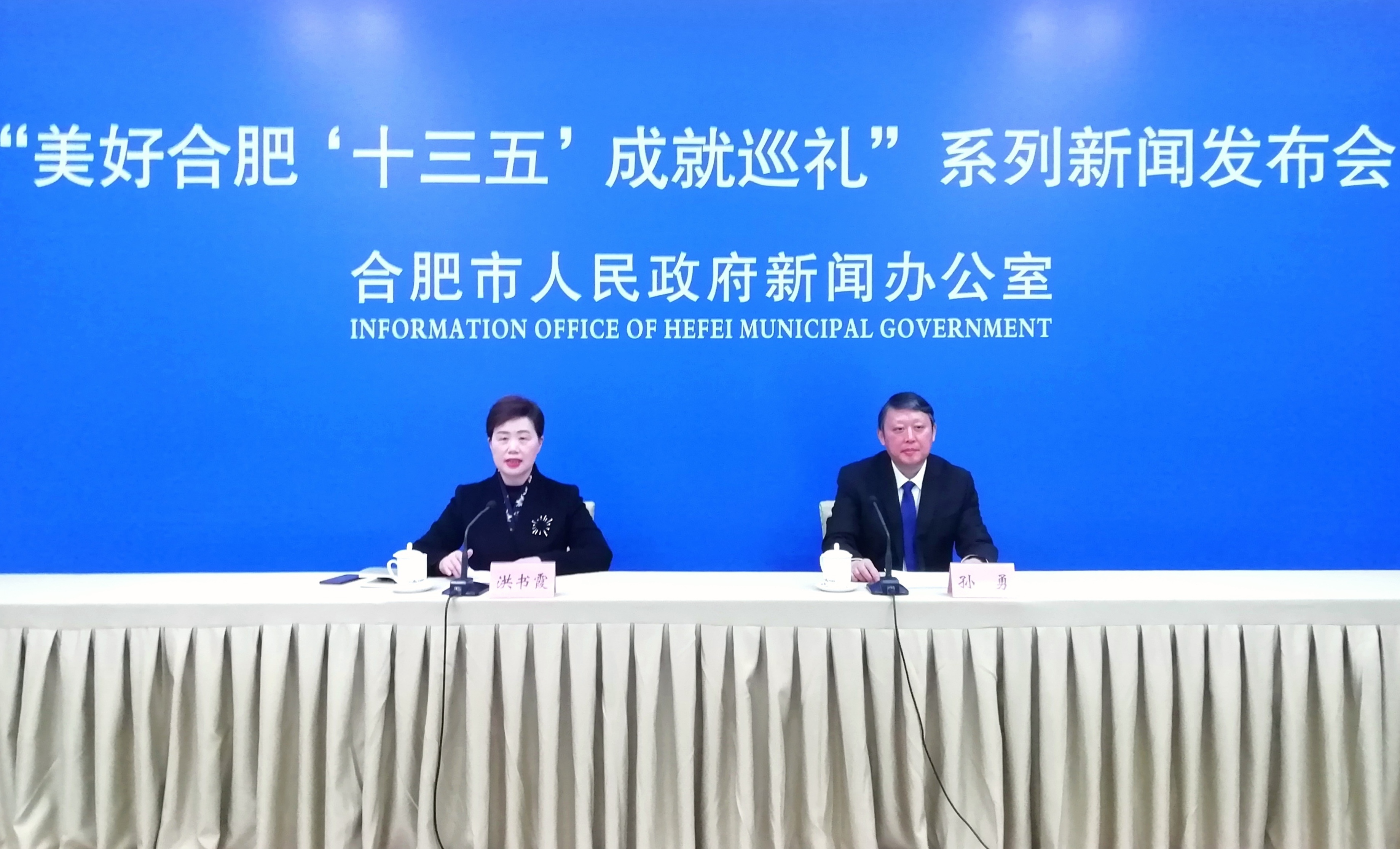 “美好合肥‘十三五’成就巡禮”系列新聞發佈會(第21場),合肥市委宣傳部副部長洪書霞(左)主持發佈會,合肥市司法局黨委委員、副局長孫勇介紹相關情況(孫軍/攝)