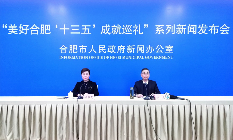 “美好合肥‘十三五’成就巡禮”系列新聞發佈會(第22場),合肥市委宣傳部副部長洪書霞(左)主持發佈會,合肥市城管局黨組書記、局長桂龍介紹相關情況(孫軍/攝)