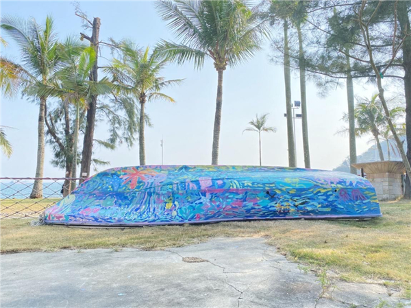 溪涌沙灘上,那棵被颱風「山竹」掀翻的大樹還靜靜地躺着,在雙城雙年展中,它是作品《海的皮膚》的主體,現在仍提醒着人們大自然的威力。度假村並沒有徹底更換被颱風損壞的一切,比如海灘旁的一處小舞台 ,瓷磚被颱風打爛,找不到一模一樣的怎麼辦?工作人員們用巧手畫上翻滾的鯨,成為了孩子們最愛的舞台。