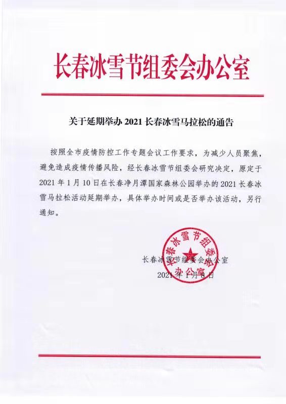 1月8日,長春冰雪節組委會辦公室發佈《關於延期舉辦2021長春冰雪馬拉松的公告》。