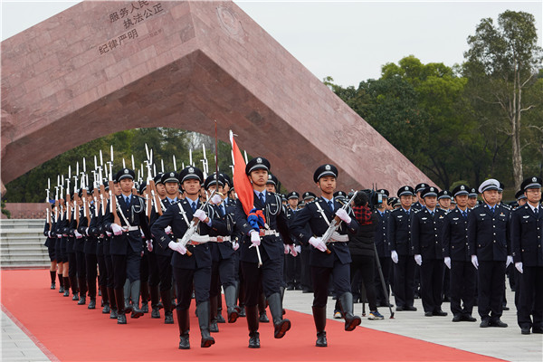 1月10日是首個中國人民警察節,廣東省公安廳在廣東公安英雄廣場隆重舉行升警旗儀式。當天上午10時,神聖莊嚴的升警旗儀式在全場齊聲奏唱《中華人民共和國國歌》聲中拉開序幕,40名警旗護衛隊員英姿颯爽、氣宇軒昂,他們組成護旗方陣,邁着鏗鏘有力、整齊劃一的步伐,沿着廣東公安英雄廣場中軸線將警旗護送至升旗台。儀式現場奏響《中國人民警察警歌》,承載着榮譽和使命的警旗在激昂雄壯、催人奮進的歌聲中冉冉升起。來自廣東公安廳機關副處級以上領導幹部和民警代表,廣東公安實戰大練兵特警代表、廣東公安警務實戰教官特訓營教官代表,廣州、佛山市公安局民警輔警代表共1000人參加儀式。(記者 黃裕勇)
