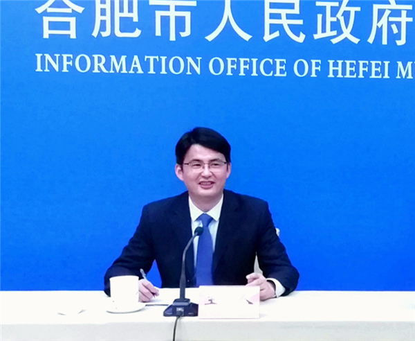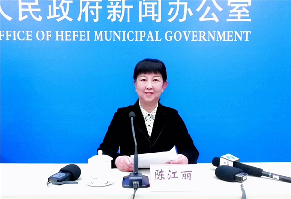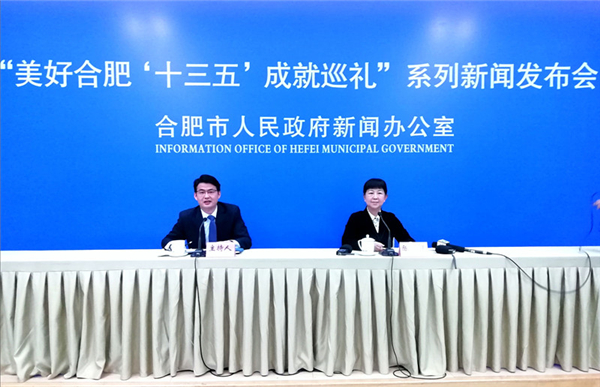“美好合肥‘十三五’成就巡禮”系列新聞發佈會(第25場),合肥市委宣傳部外宣辦主任趙明錄(左)主持發佈會,合肥市文旅局黨組成員、副局長陳江麗介紹相關情況(孫軍/攝)