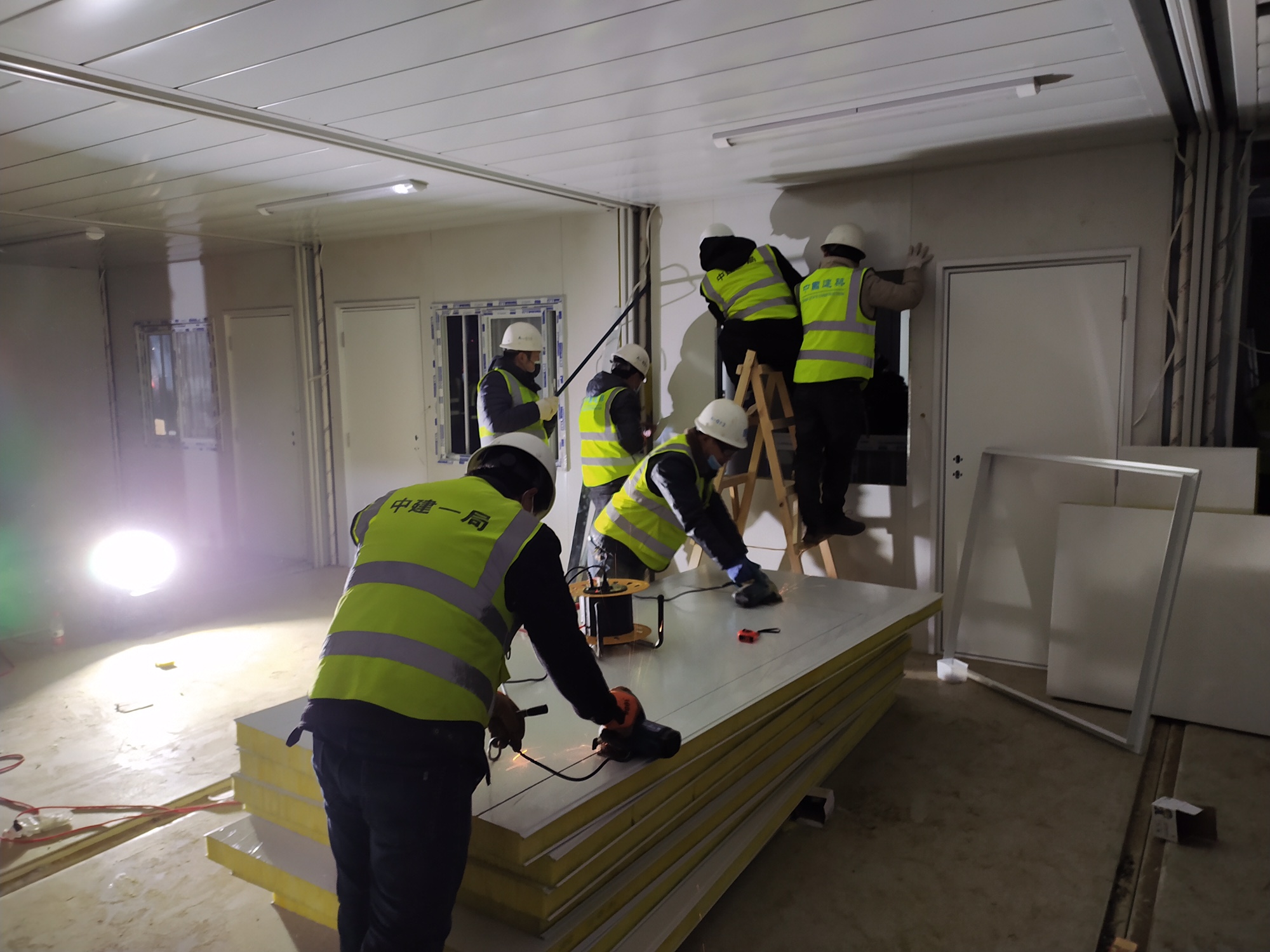 大家迅速進入工作狀態,科學調配資源。「隔離用的集成房,要比平時建的辦公和住宿場所要求高很多,每間集裝房面積為18平米,既要協調確保安裝的進度,還要保證質量。」「工作方案隨時都在更新,由原來分片區承包安裝牆板這一個工序改為承包房屋內門窗安裝,到現在需安裝連同隔離設施、門鎖等五金安裝等整體房屋配備。後續還在不斷調整。分隊伍分片區兩端同時開展建設的工作方式現在亦改為了所有人集中突擊一個房間。」