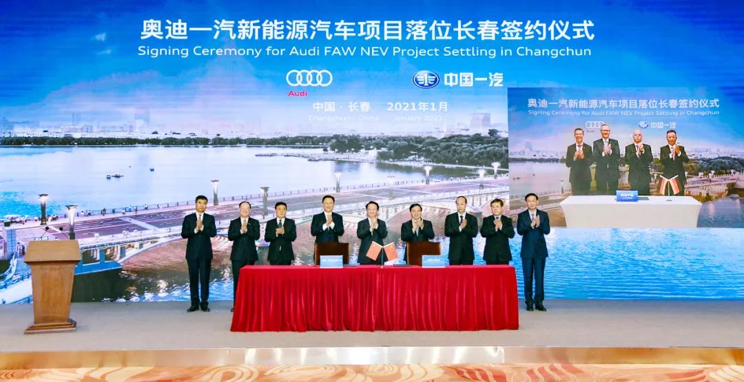 1月18日,中國一汽集團、德國奧迪公司、長春市政府以視頻連線方式簽署三方協議,宣布一汽奧迪新能源汽車項目落位長春。吉林省委書記景俊海出席簽約活動並致辭。吉林省委副書記、代省長韓俊主持簽約。