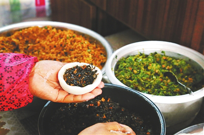 吳大姐一邊介紹,一邊用手包着粑粑。只見她先將米麵挖出一個洞,然後熟練地將餡放進去,再封口,搓成圓形,壓扁,一個粑粑就做成了。桌上,放着三盆餡,分別是蘿蔔、青菜、馬齒莧。