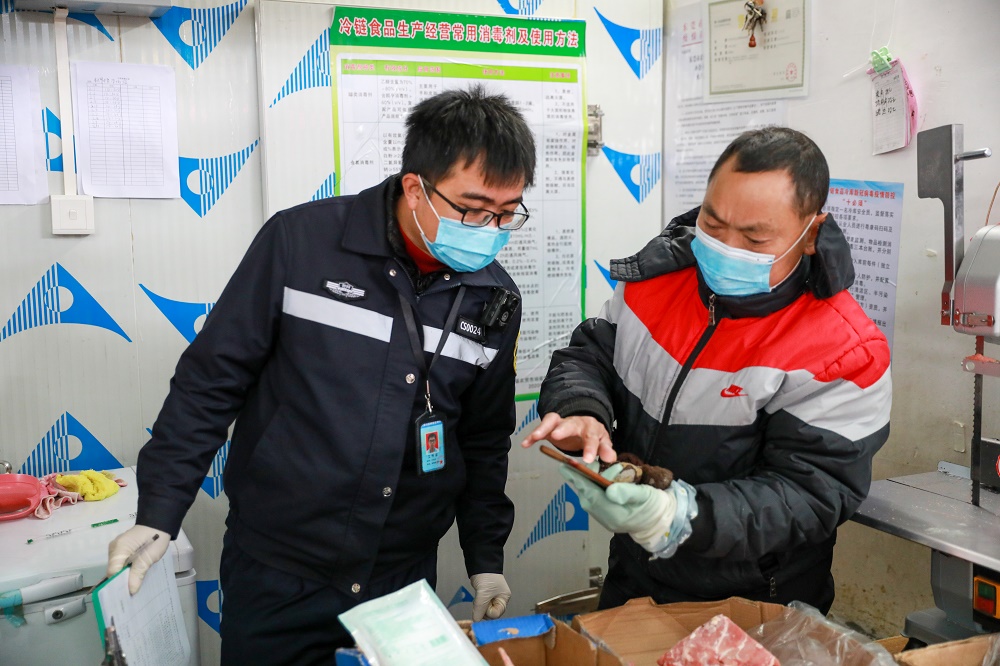 行動中,執法人員到轄區內農貿市場的冷庫、凍肉店進行檢查,重點檢查經營戶的營業執照、冷凍倉庫倉儲信息、進銷台賬,核查「一單三證」,包括供應商(委託方)的資質及進口冷鏈食品的報關單、入境貨物檢驗檢疫證明。同時,還對進口冷凍肉製品和水產品核酸檢測證明、消毒證明等文件進行核查。