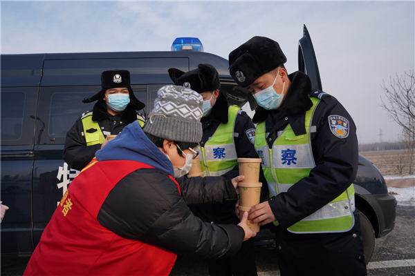 據愛心志願者劉立君介紹:「我們今天早上3點多就過來熬粥的,一共熬了28鍋。」在龍江縣北出城口卡口,愛心志願者們將一碗碗熱乎乎的臘八粥送到執勤人員手中,為他們驅走冬日的嚴寒。正在卡口執勤人員劉森表示:在卡點執勤,雖然天氣很冷,但感受到了來自各方面的問候,心裏暖暖的。