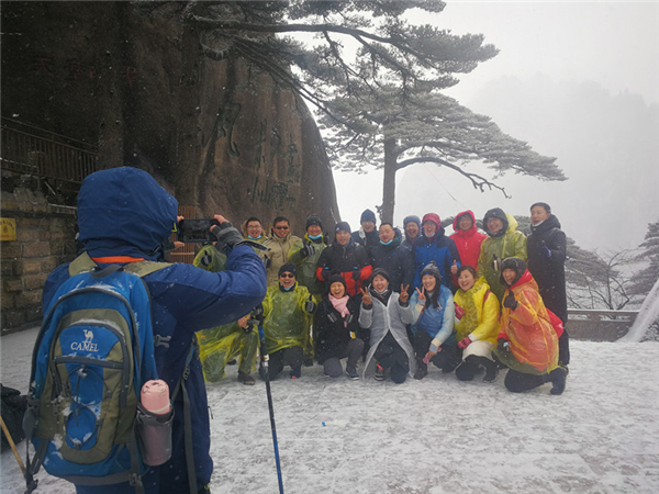 遊人在迎客松前合影 孫南華攝
