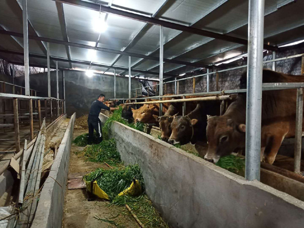 隨後的日子裏,他在不放棄傳統豬肉皮加工的同時,將心思和精力放在養牛上,為吸取經驗教訓,他定時對牛場做消毒處理,按時給牛打口蹄疫針,做到防患於未然。他和妻子起早貪黑割草餵食,夏季做好通風,冬季給牛群做好保暖防護,每天關注牛群生長狀況,將黃牛當做心愛的“孩子”全身心呵護。