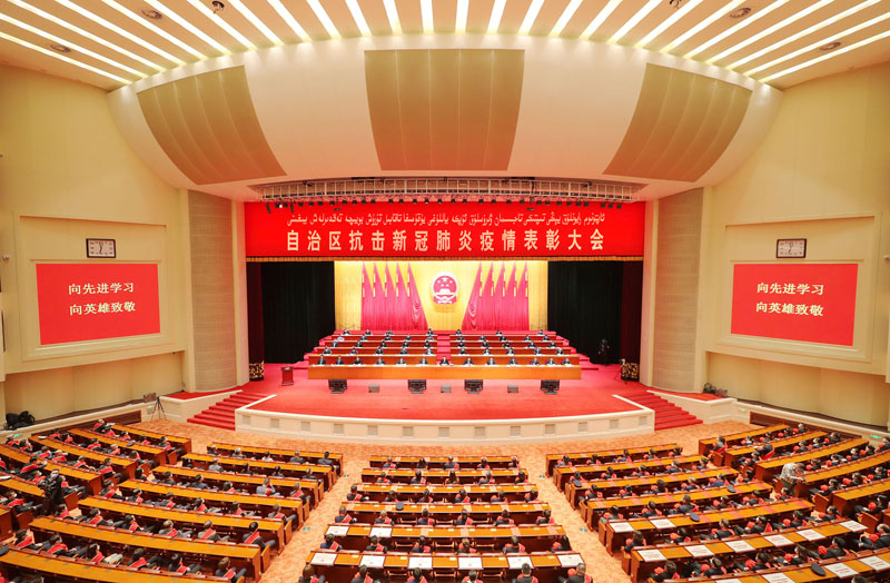 10時30分,大會開始。全體起立,高唱中華人民共和國國歌。自治區黨委副書記李鵬新宣讀了《自治區黨委、自治區人民政府關於表彰自治區抗擊新冠肺炎疫情先進個人和先進集體的決定》《自治區黨委關於表彰自治區優秀共產黨員和先進基層黨組織的決定》。陳全國、雪克來提·扎克爾等為受表彰的個人和集體代表頒獎。