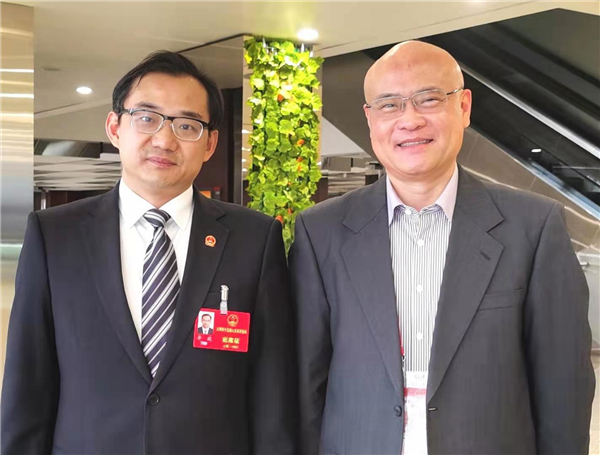 上海市人大代表、崇明區委書記李政(左)接受本報記者(右)專訪