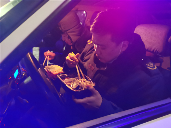 盒飯已經涼了,大家只能在凳子上或車裏喝點熱水,簡單吃幾口。大家都覺得,守護好世紀大道入城口這一外防輸入的第一道防線,再辛苦都值得。