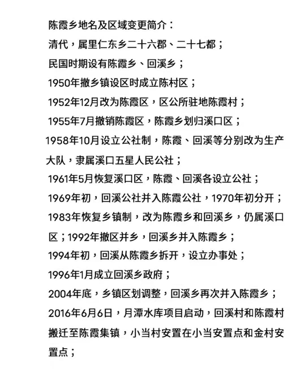 原陳霞鄉位於主庫區,涉及陳霞村、回溪村、小珰村33個村民小組,征地9916畝,整體搬遷30個村民組2176戶5970人,拆除房屋面積40萬平方米。經過4年多的努力,2020年12月31日,月潭水庫順利下閘蓄水。