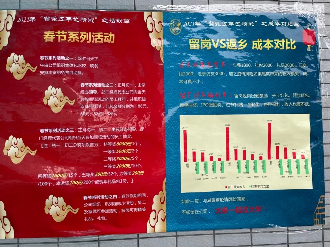 據該負責人介紹,公司通過加大防疫知識宣傳,高層管理人員主動帶頭留莞,呼籲員工儘量選擇留莞過年,減少人員流動和聚集。目前員工總數1360人左右,預計留莞員工超1000人。一線員工2月工資綜合收入最高的可達到15700元,不包含抽獎紅包。