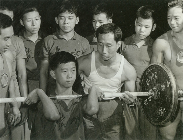 陳鏡開(前排右一)在指導陳偉強(前排左一)舉重技巧