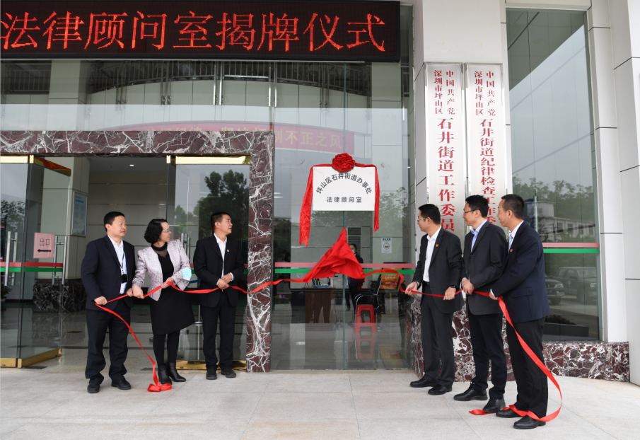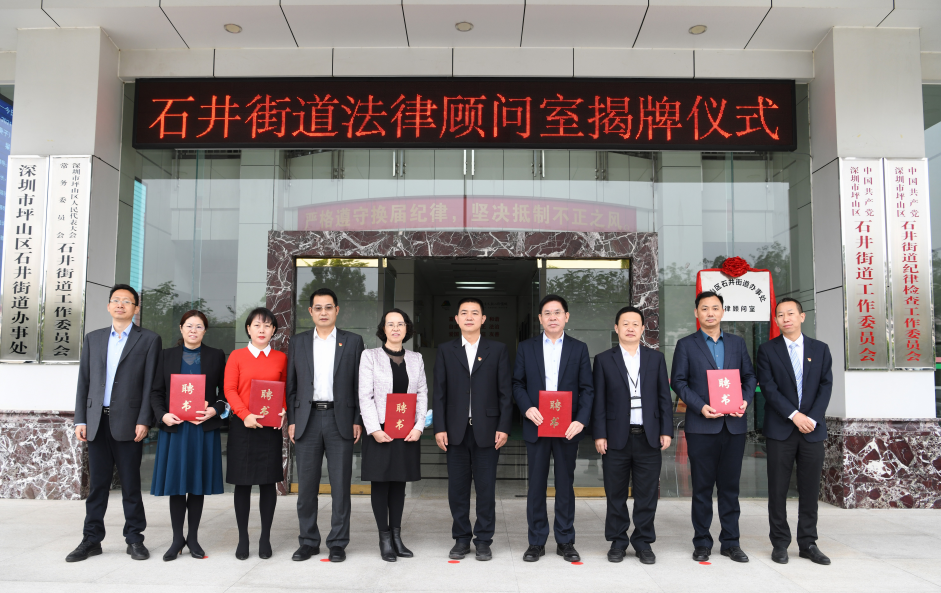 1月27日上午,深圳市第一個街道法律顧問室在坪山區石井街道揭牌。坪山區委常委、政法委書記邵寶洲,石井街道黨工委書記何建輝,區司法局局長白寧出席儀式並致辭,石井街道黨工委副書記、辦事處主任龔德宇主持揭牌儀式,深圳大學法學院教授、碩士生導師曾月英,石井街道黨工委副書記張曲紋和街道各部門各社區負責人、法律工作者等參加活動。