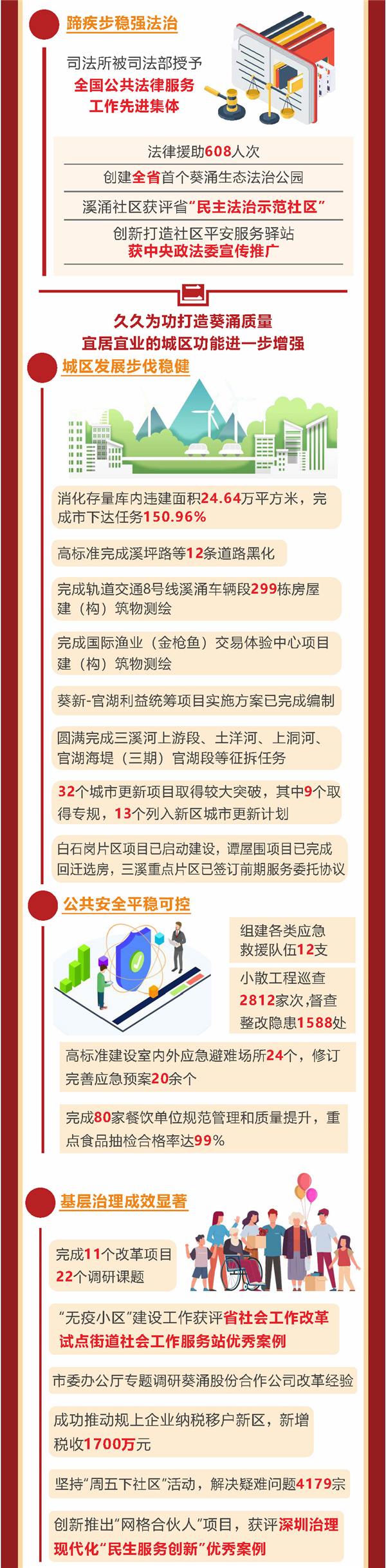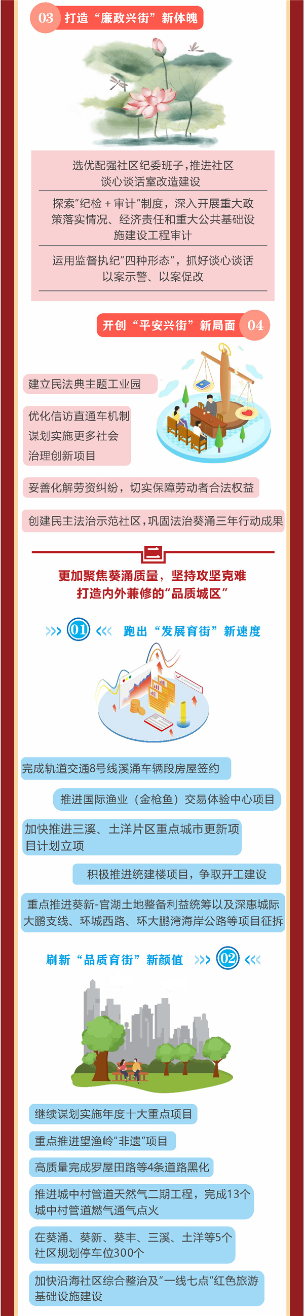 他還強調,新征程開啟之際,葵湧上下要自覺站位新發展階段,堅定貫徹新發展理念,主動融入新發展格局,積極弘揚為民服務孺子牛的精神、發揚創新發展拓荒牛的風格、使出艱苦奮鬥老黃牛的力量,萬眾一心、矢志篤行,圍繞葵涌規矩、葵涌質量、葵涌生態,一張藍圖干到底,一項接着一項干,用奮鬥創造美好生活,用實幹書寫滿意答卷,以優異成績慶祝建黨100周年和新區成立10周年。(記者 羅國淮 通訊員 凌桂濤 李熠陽)