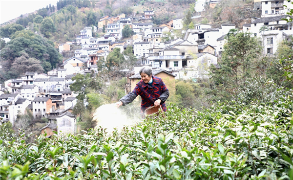 1月27日,安徽黃山市歙縣昌溪鄉萬二村農民汪永琴在茶山上給茶棵施“菜枯”。