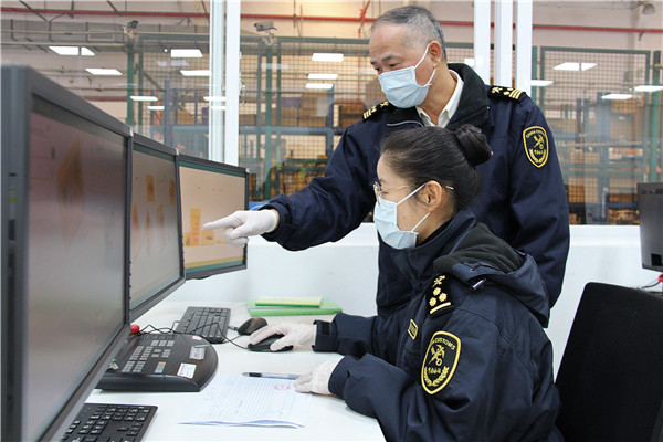 廣州海關所屬廣州白雲機場海關關員正在對跨境電商包裹進行同屏機檢作業(苗瑞琴攝)
