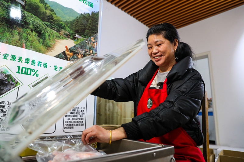 1月26日,年關已近,大源河畔的大源山莊停車場周圍掛滿了喜慶的紅燈籠,透著一股濃濃的年味。寬敞明亮的廚房裏,老闆娘許秀先正忙著燒菜,一大鍋鹹肉煮小竹筍“咕嘟咕嘟”冒著誘人的香味。“這是今天中午客人點的菜,筍子是春天山上拔來醃的,口感非常好,客人都喜歡吃。”許秀先一邊忙活一邊說。