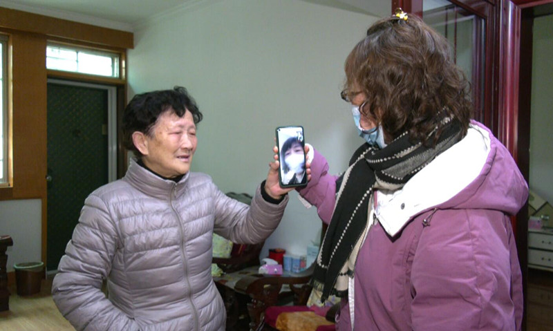 “你們在外面過年不能回來,你媽媽一個人在這邊,請你就放心好了。(好的,謝謝你們)不客氣,不客氣。”在珠塘社區居民黃金娣家中,社區工作人員正通過老人家的手機和遠在日本的女兒進行視頻。