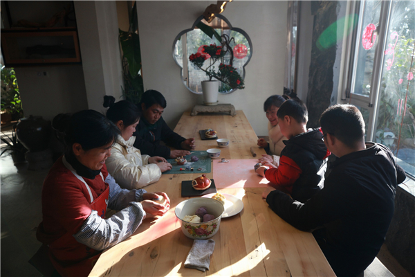 來自湖南的李靜是當地中學的一名教師,來自江西的曾國星是一家快遞公司的職員,這個春節,他們都改變了回老家過年的計划,正帶著家人在當地民宿準備過大年,他們和民宿主人、村民們一起學做花饃年獸面點。
