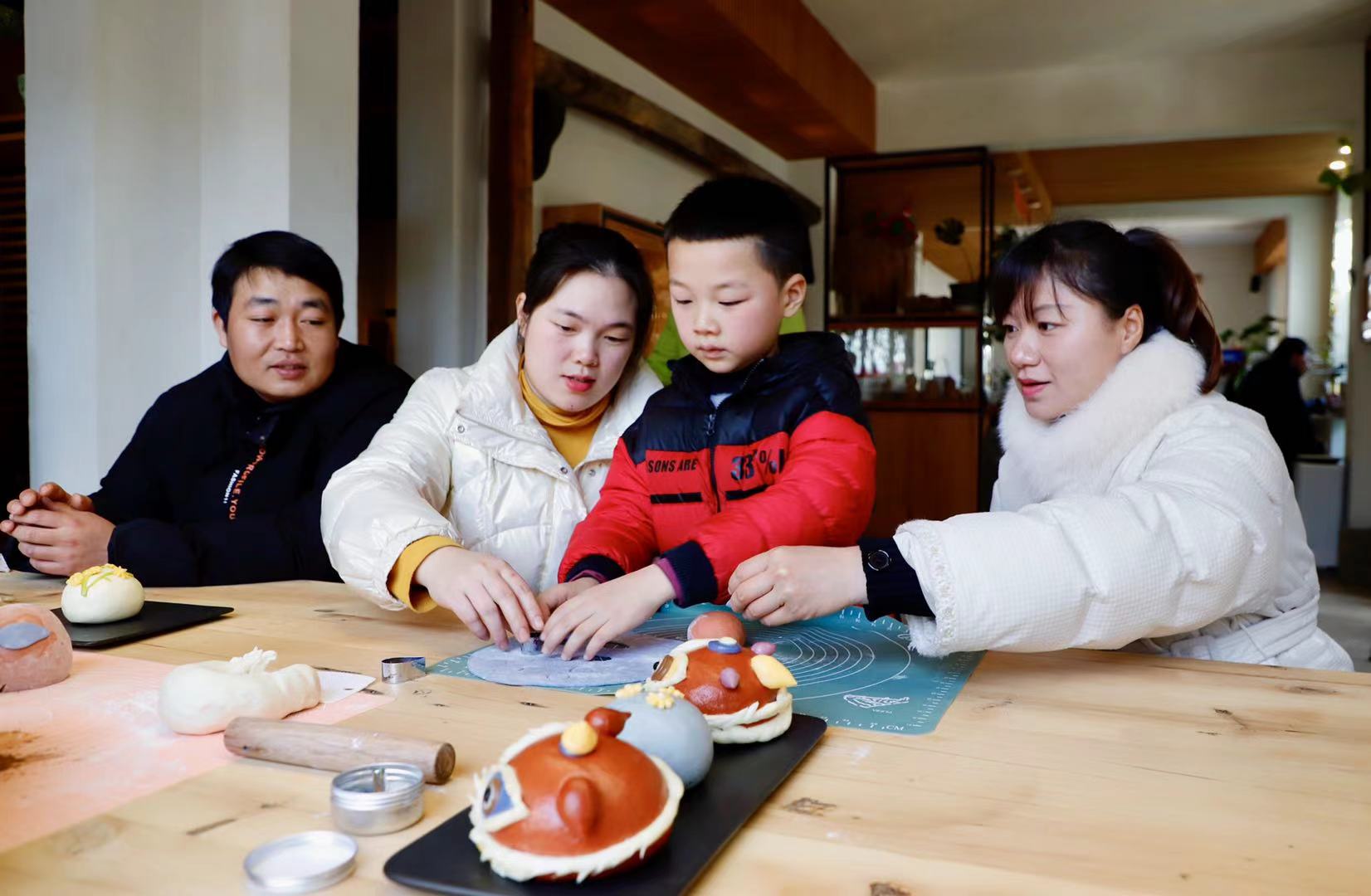 2月5日,適逢南方小年,在徽州區西溪南鎮上村的溪香花園民宿內,留守徽州過年的湖南李靜一家和江西曾國星一家正在女主人的帶領下,學做花饃年獸面點。“西溪南鎮策劃的留守徽州過年活動,邀請我們一家參與。雖然是第一次在異地過年,但還是感覺特別溫暖。”李靜夫婦都是外地人,雖然在徽州區工作十幾年,但是放假後,一家總會回老家過年,今年,他們一家是第一次選擇留守徽州過年。