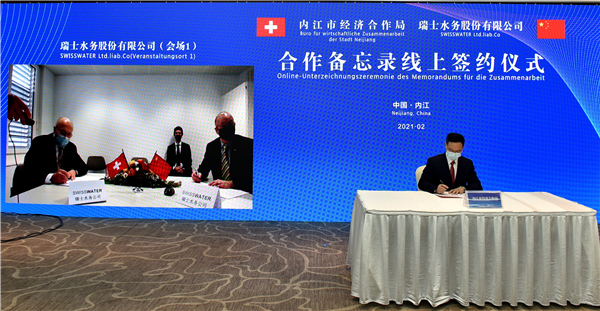 當天北京時間下午5時,瑞士時間上午10時,四川省內江市經濟合作局與瑞士水務股份有限公司舉行線上簽約儀式,雙方以「線連線」「屏對屏」形式,創新簽約方式,變「見面簽」為「網上籤」,順利完成各項簽約程序。