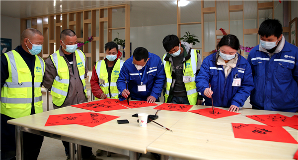 中國五冶10名項目管理人員和24名農民工代表歡聚一堂,大家一起寫對聯【鄧超 攝】