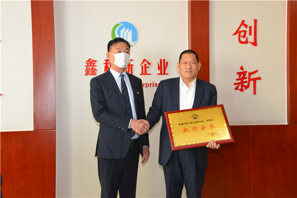 新疆河南工商企業聯合會會長孫磊(左)為新疆鑫和新環衛綠化有限公司黨支部書記、總經理;烏魯木齊經濟技術開發區(頭屯河區)政協常委、志願服務協會會長王新河(右)頒授入會牌匾