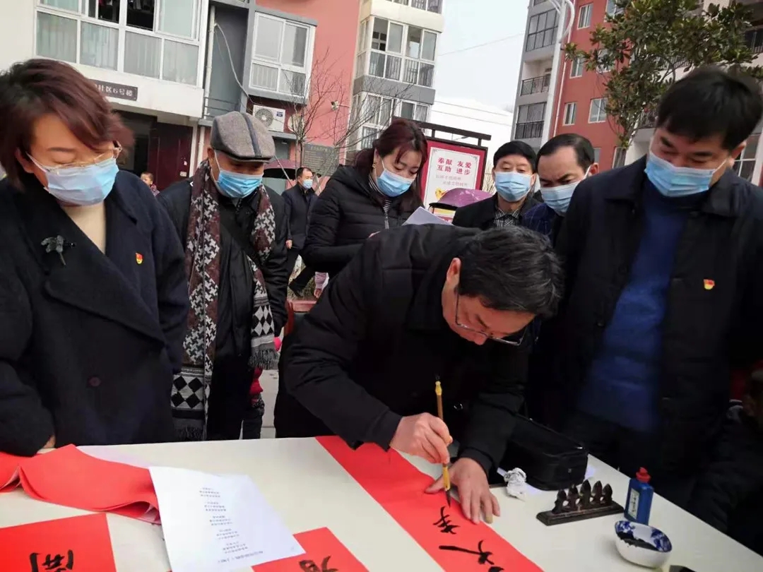 臘月二十三陰曆小年的下午,河南省淅川縣上集鎮光明社區生活廣場上,從四面八方趕來的群眾帶着口罩,排隊等候,數十位書法家和楹聯專家圍在長長的几案周圍,現場為群眾撰春聯、寫春聯、送春聯,為父老鄉親送上牛年新春的美好祝福。鮮艷的紅紙,噴香的墨汁,幸福的笑臉,高掛的彩燈,挺拔的樓群,無不洋溢着節日的喜慶和濃厚的年味兒。