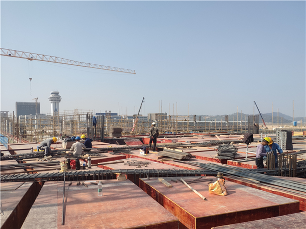 揭陽潮汕機場航站區擴建工程工地上,工人們正在進行綁紮梁鋼筋施工(作者:蔣健)
