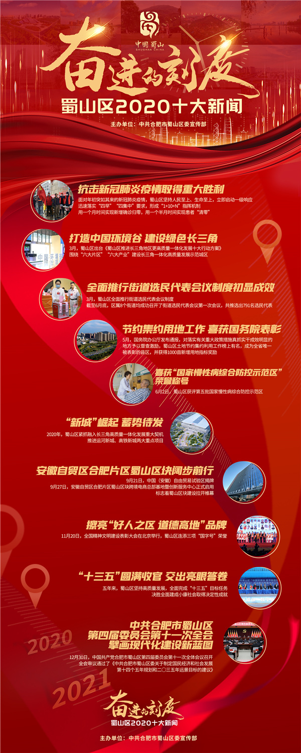 回顧過去,是為了更好的前行。為激勵全區干群「十四五」昂揚再出發,2021年1月中旬,蜀山區委宣傳部啟動「奮進的刻度——蜀山區2020十大新聞」評選活動,全面展示蜀山區2020年發展成果。
