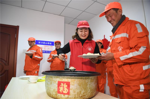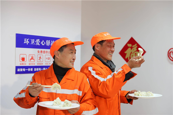 據了解,春節期間,包河區城管局2000多名環衛工人大多選擇就地過年、堅守崗位。春節期間,志願者將陸續送來水餃、點心、水果等物品,陪工人們在崗位過年。