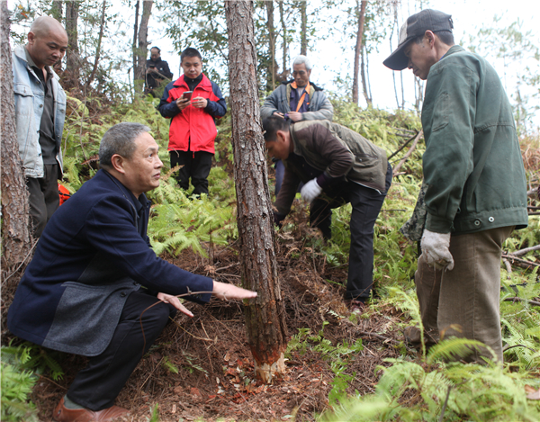 贛州市林業有害生物防治檢疫局教授級高工(左二)現場培訓松材鄉村處置隊伍