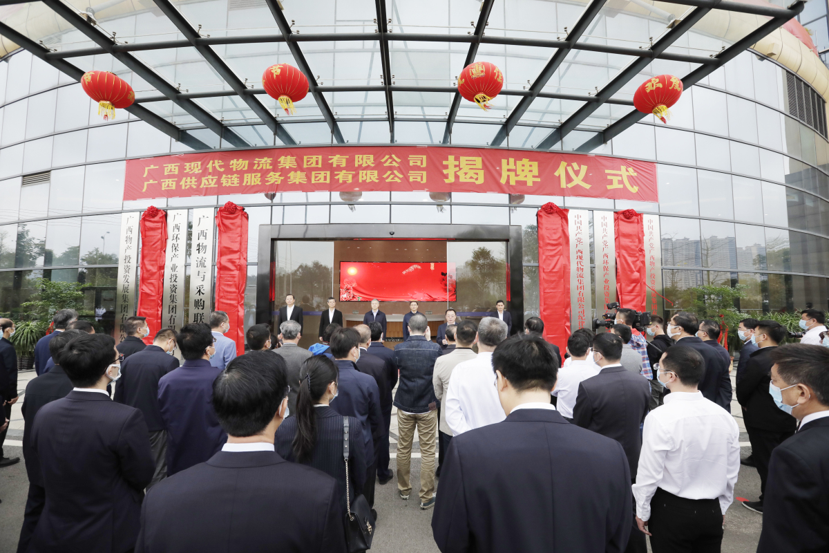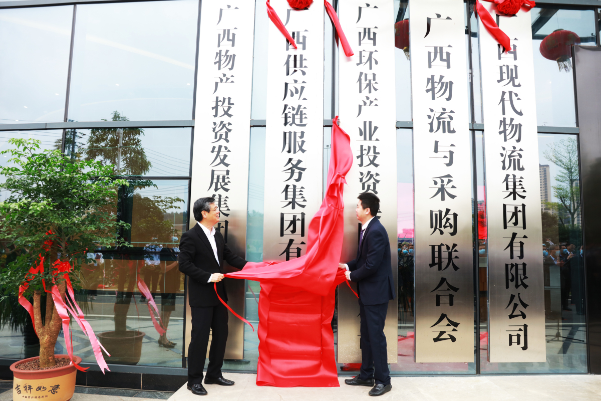 廣西現代物流集團黨委書記、董事長戴毅,廣西供應鏈服務集團總經理傅文剛為廣西供應鏈服務集團有限公司揭牌