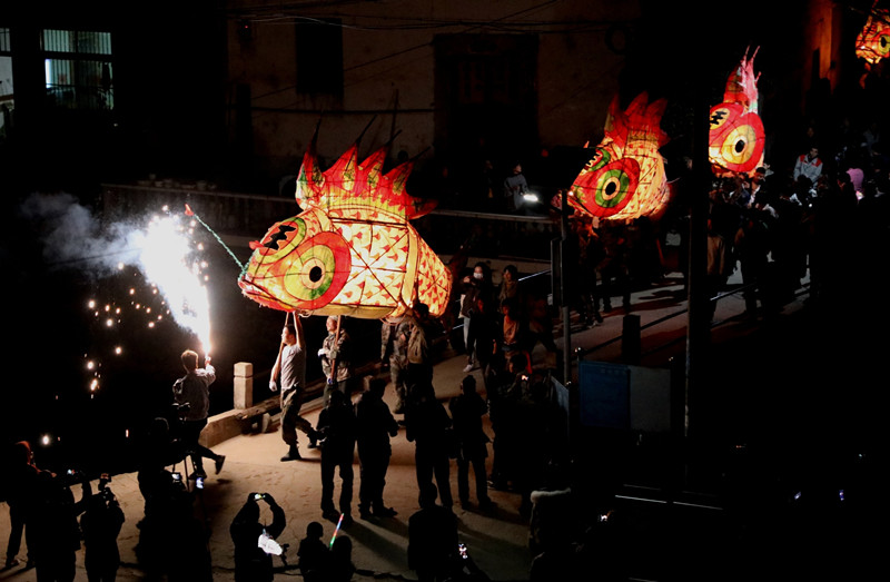 嬉魚燈隊伍在所有路線進行完畢後,還會匯合在村中的操場上起舞狂歡,祈願新的一年平平安安、年年有餘。